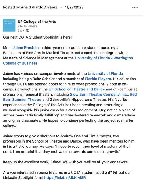 As the student communications assistant, I created and implemented the most promising strategies to promote the various College of the Arts departments. Through planning and executing social media content, interviewing, networking and community outreach, I was able to encourage students at the University of Florida, and in the surrounding community to be engaged with their college.